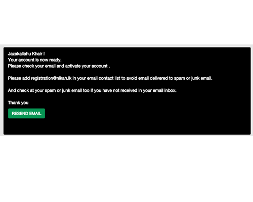 If you have not received an email from registration@nikah.lk within few minutes, click RESEND EMAIL to get the verification email again.
