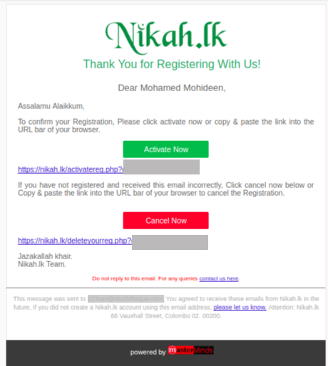 Please check your junk / spam email too if confirmation email is not received in the email inbox. Add our email address registration@nikah.lk in your contact list to avoid being delivered in spam / junk email.