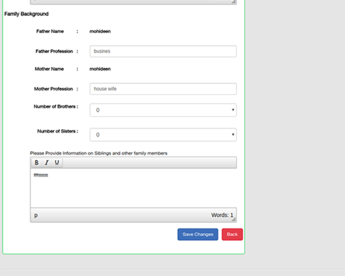 உங்கள் சுயவிபர விபரங்கள் மற்றும் விருப்பும் வாழ்க்கைத்துணை விபரங்களை நீங்கள் Edit பண்ண முடியும். விபரங்களை மாற்றங்கள் செய்யும்போது, Update பொத்தானை கிளிக் செய்தால் மட்டுமே உங்களது மாற்றங்கள் Save செய்யப்படும்.அந்தந்த விபரங்களின் பிரிவில் உள்ள Update பொத்தானைக் கிளிக் செய்ய வேண்டும்.